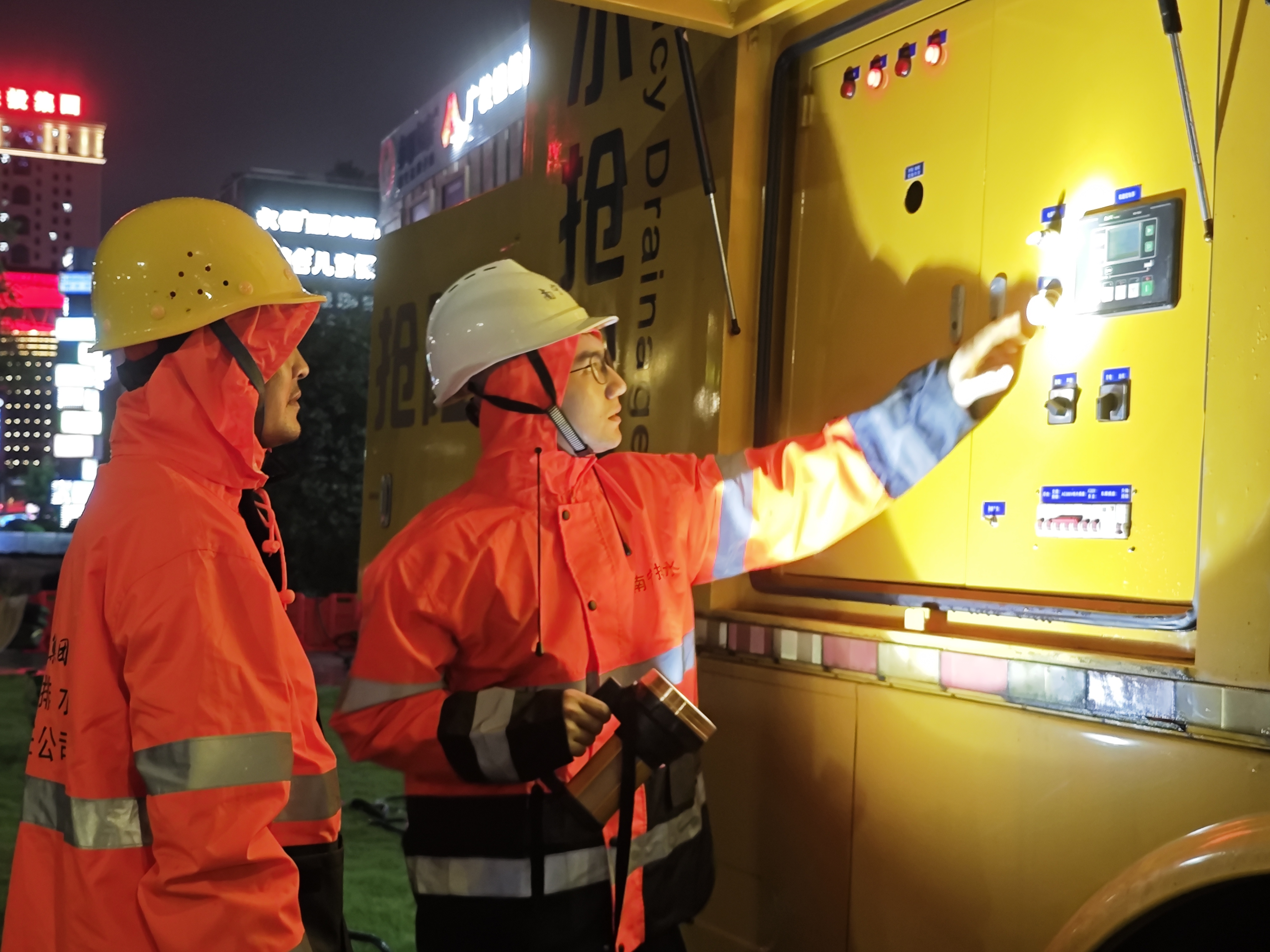 工作人員操作排水搶險(xiǎn)車輛進(jìn)行抽排處置