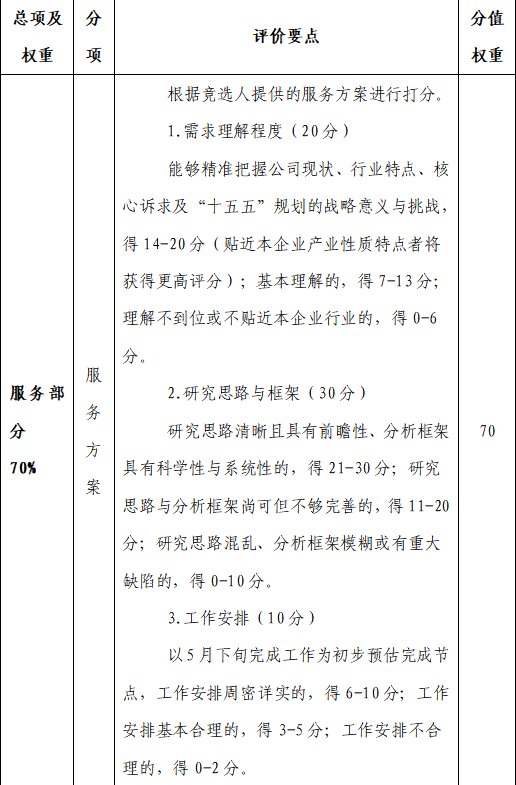 評(píng)審方式采用綜合評(píng)分法,由評(píng)審人員根據(jù)評(píng)分辦法(詳見(jiàn)第八條)進(jìn)行打分,并按照分?jǐn)?shù)由高到低順序確定中選單位,總分相同時(shí)按注冊(cè)資本金由高到低順序排名。