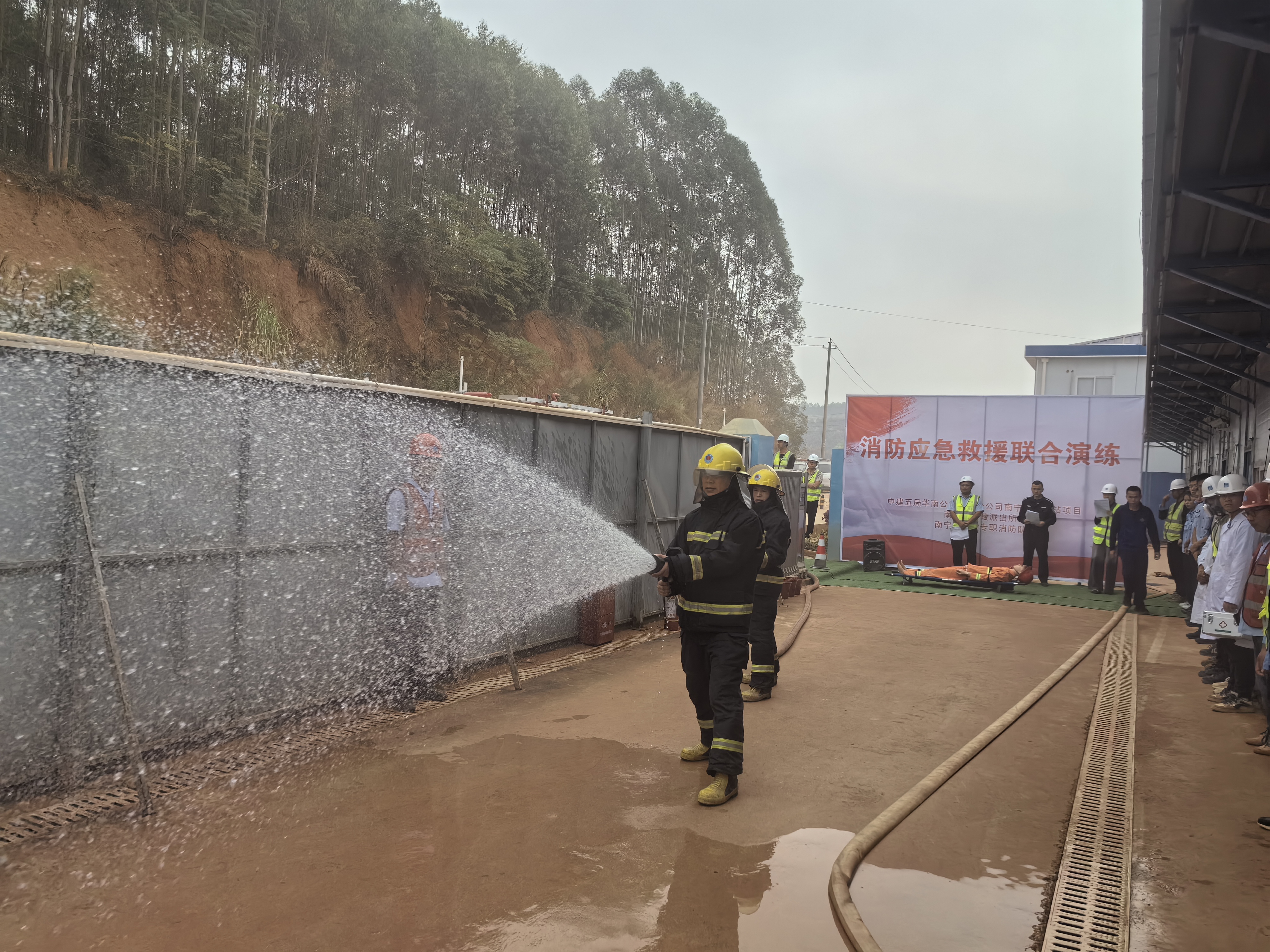 本次消防演練模擬的場景為工人生活區(qū)板房突發(fā)大火,有1名工人被困,項目部即刻啟動消防緊急預案,設置警戒疏散組、應急救援組、通訊聯絡組和醫(yī)療救護組,派出所工作人員配合協調開展“滅火”工作,消防隊將消防車駛入現場工人生活區(qū),啟動消防車水泵的救援全過程。